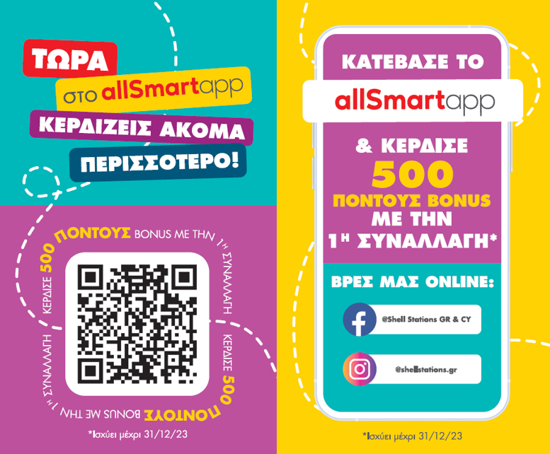 Κατέβασε τώρα την εφαρμογή allSmart app, σύνδεσε την κάρτα σου ή έκδωσε μία νέα άυλη κάρτα και ΚΕΡΔΙΣΕ 500 ποντους με την πρώτη συναλλαγή σε ένα πρατήριο Shell!
